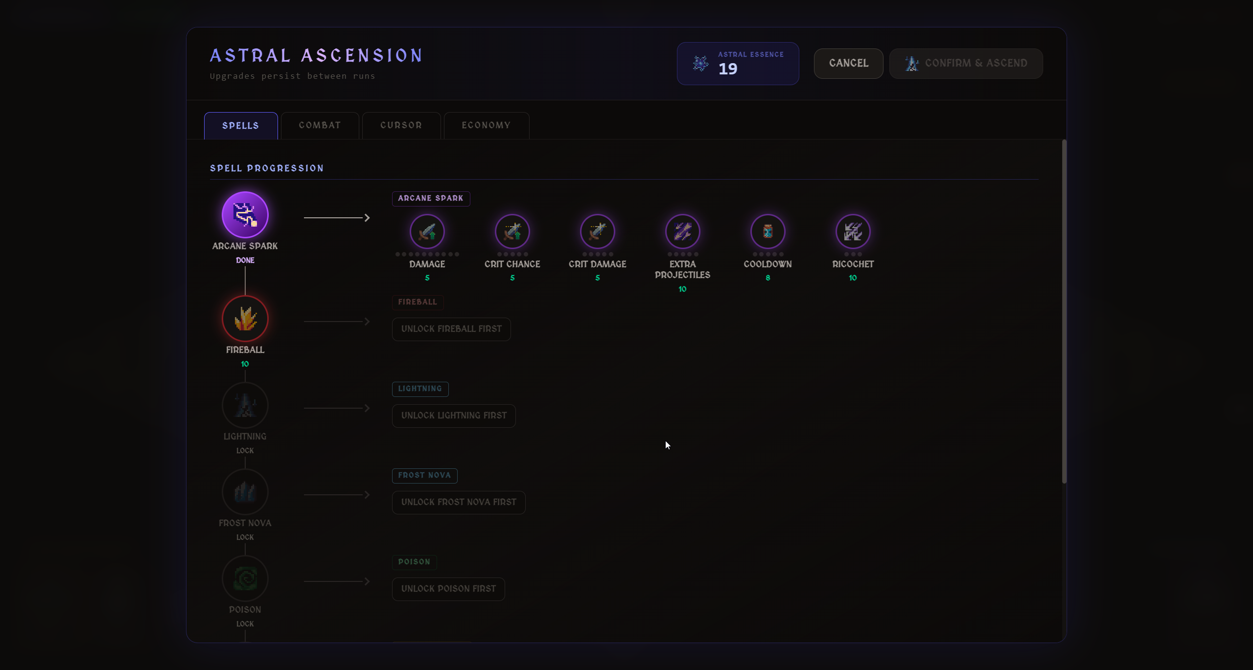 Between runs, spend Astral Essence in the Ascension to permanently unlock spells, boost your damage, and bend the rules of combat in your favor.